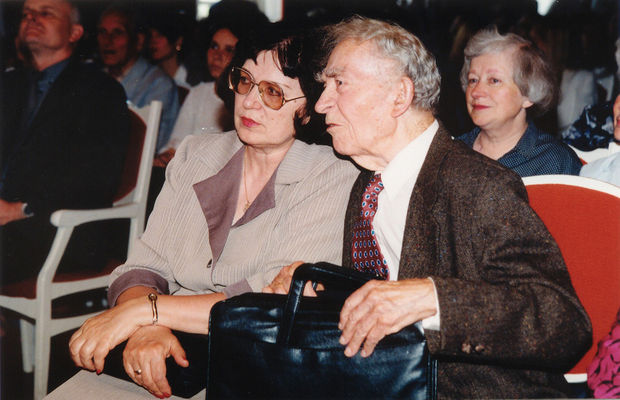 „Varpų“ vakaro Šiaulių universitete akimirka. Poetas Bernardas Brazdžionis ir „Varpų“ redaktorė Silvija Peleckienė. 1999 m. birželio 3 d. Antano Dilio nuotr.