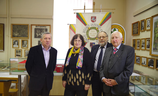 „Varpų“ vakaro svečiai rašytojai – Lietuvos Nepriklausomybės Akto signataras Stasys Kašauskas ir ilgametis žurnalo „Metai“ vyr. redaktorius Danielius Mušinskas – J.Janonio gimnazijos muziejuje. 2019 m. spalio 24 d. „Varpų“ archyvo nuotr.